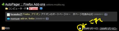 はてブはAutopagerizeきかないなと思ってたらはてブ自体にのページ自動ロード機能ってのがあることに昨日気づいた。 はてブの一番下の日付の左のこれと書かれてるところをクリックして緑になったら完了。 日付じゃなく設定してる人は前のページ次のページと…